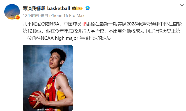 美媒NBA Draft Room公布了最新2028年NBA选秀预测榜单,显示郇斯楠首轮第12顺位被选中,相比之前预测的第14顺位上升两个顺位。